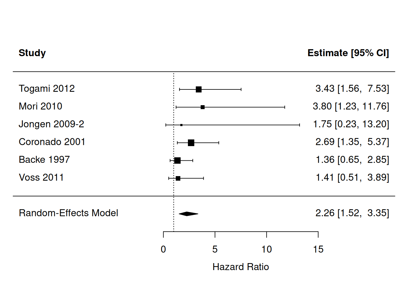 metafor::forest(x = Zhang$HR, ci.lb = Zhang$HR.025, ci.ub = Zhang$HR.975, slab =