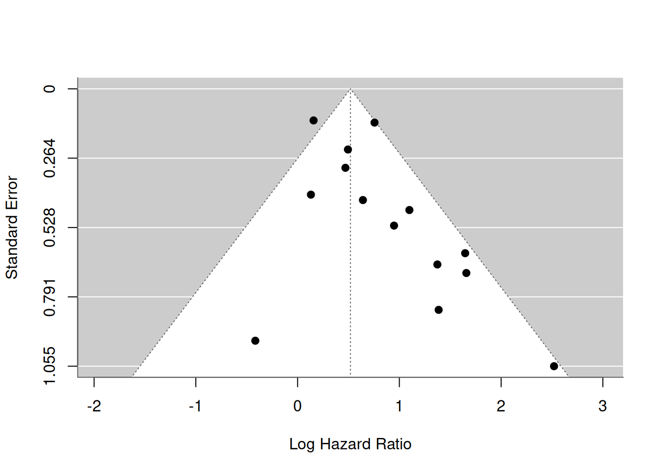 The presence of small-study effects is a common threat to systematic reviews and meta-analyses. Small-study effects is a generic term for the phenomenon that sometimes smaller studies show different, often stronger, effects than the large ones (Debray and Riley 2018). One possible reason is publication bias. Previously, D. G. Altman (2001) argued that it is probable that studies showing a strong (often statistically significant) prognostic ability are more likely to be published. For this reason, it is important to evaluate the potential presence of small-study effects, which can be verified by visual inspection of the funnel plot. In this plot, the estimate of the reported effect size is plotted against a measure of precision or sample size for each included study of the meta-analysis. The premise is that the scatter of plots should reflect a funnel shape, if small-study effects do not exist (provided that effect sizes are not substantially affected by the presence of between-study heterogeneity). However, when small studies are predominately in one direction (usually the direction of larger effect sizes), asymmetry will ensue.