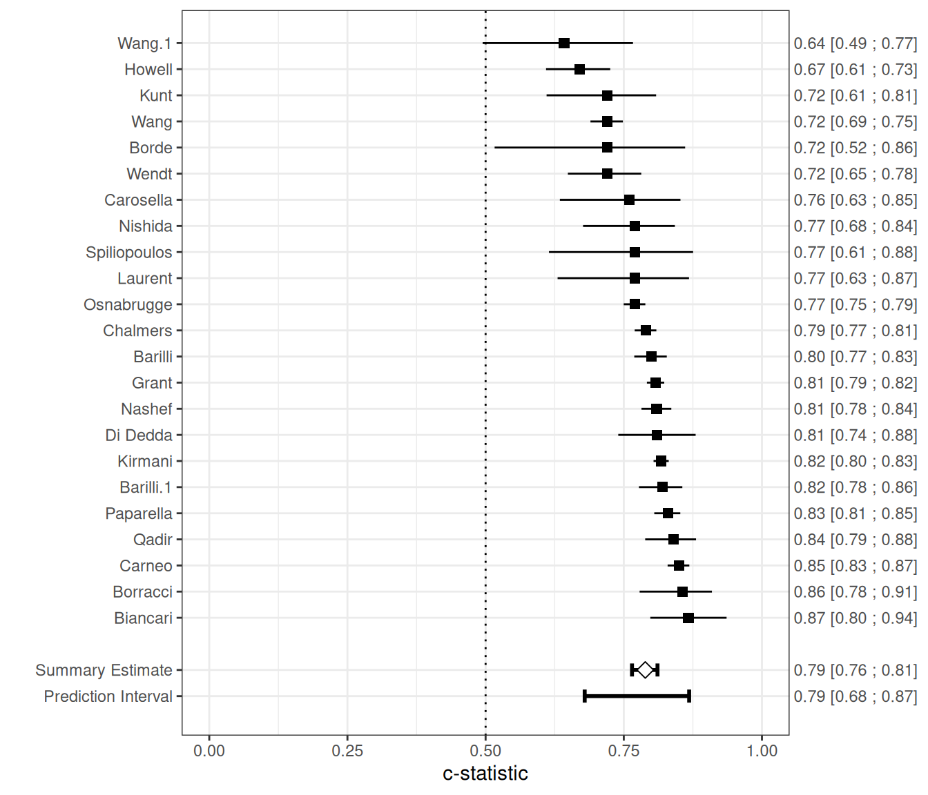 The figure below provides a forest plot summarizing the estimated c-statistics across external validation studies.